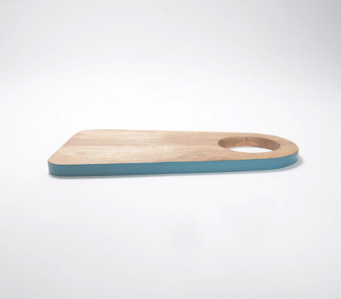 Made with supreme quality solid wood, this chopping board with a teal border deserves a place in every kitchen! Hand cut wooden offerings are as close as they get to being raw and natural. The process starts with logs of wood being cut into flat slabs using saws. Usually two men hold the wood firmly, ensuring that the resultant slabs are cut to perfection. These pieces are then marked with pencil and cut in different shapes and sizes in keeping with the design, and then handed over for further treatment or beautification. Often, artisans connect multiple blocks of wood so skillfully that it looks like a single block! The craft of wood cutting and carving is hundreds of years old and shines through in this chopping board that doubles up as a cheese platter